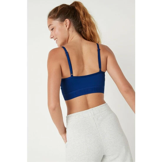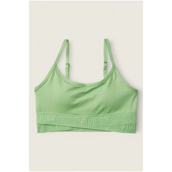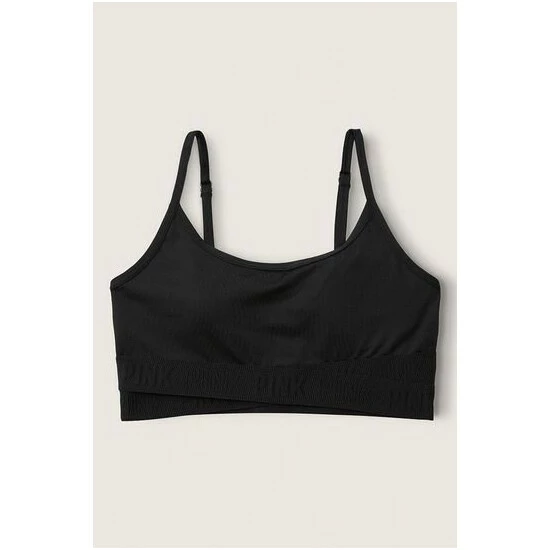 Lightly Lined. Wireless. Removable Padding. Pull-on style. Scoop neckline with adjustable straps. PINK logo elastic bottom band. Low Impact. 4-Way Stretch. Wicking Fabric. Quick Dry.