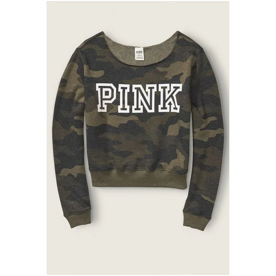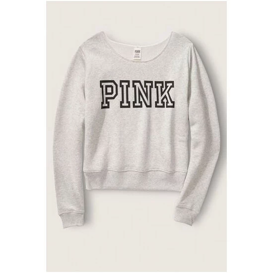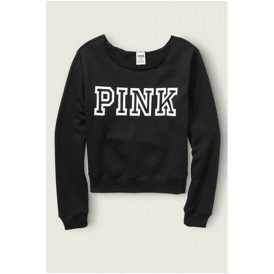 Victoria’s Secret PINK relaxed fit stretch fleece crew top. Can we worn off the shoulder and features raw edge neckline. 21″ length. 60% cotton, 40% polyester. Machine Wash.