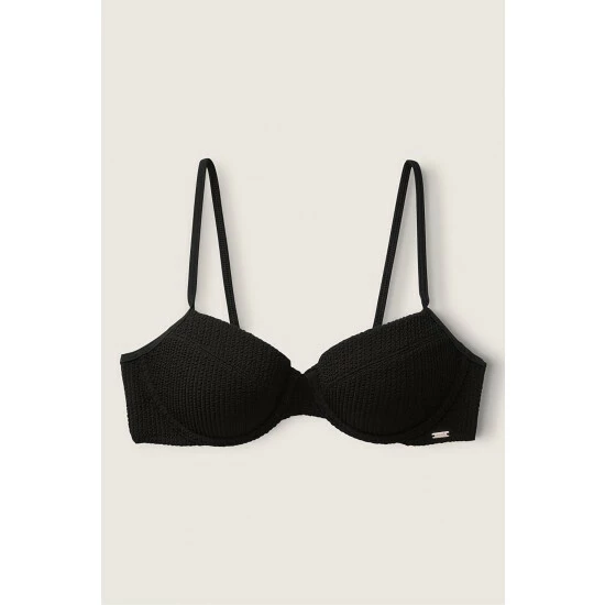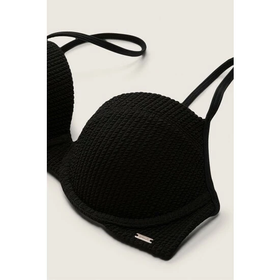 Crinkle fabric Push-up Underwire for added support Adjustable shoulder straps Swanhook closure at center back Imported: recycled polyester/elastane ;