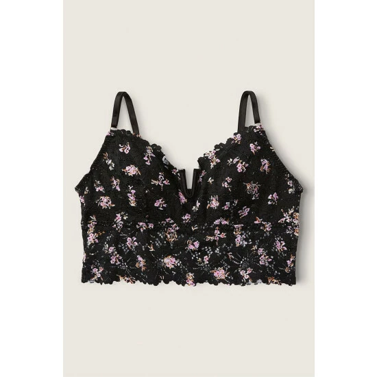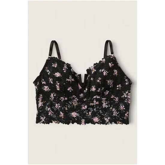 Allover Lace Fabric. Removable Padding. Padding foam is a USDA certified biobased product.. Fully adjustable straps. Pull on style. Wireless longline.