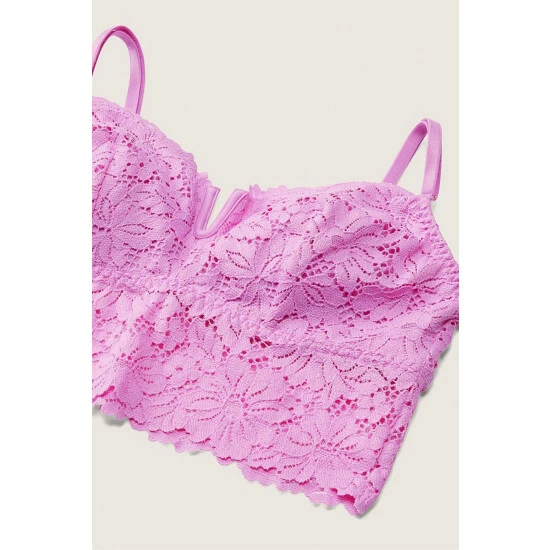 Allover Lace Fabric. Removable Padding. Padding foam is a USDA certified biobased product. Fully adjustable straps. Pull on style. Wireless longline.