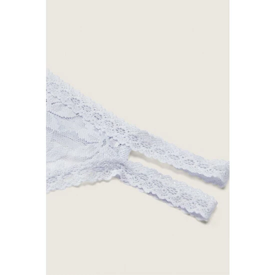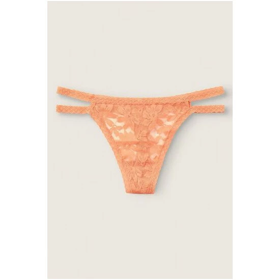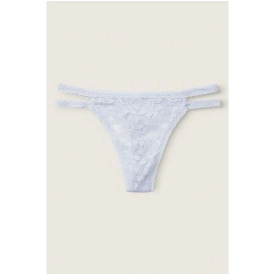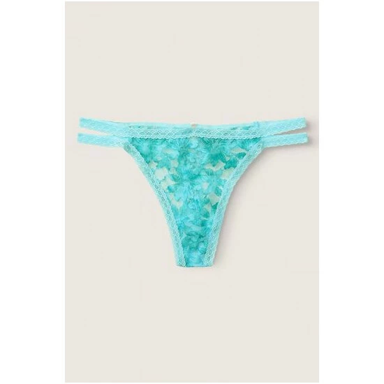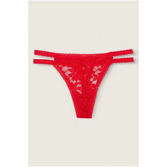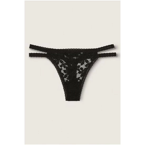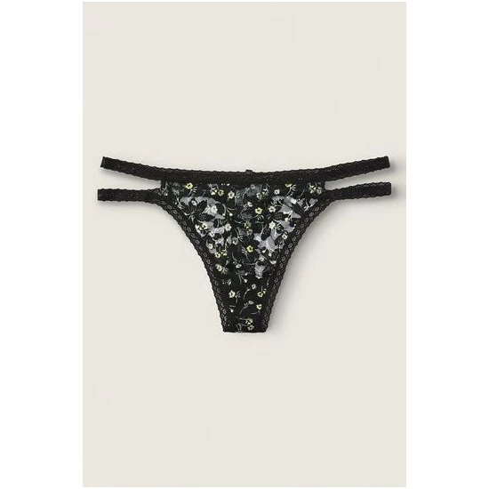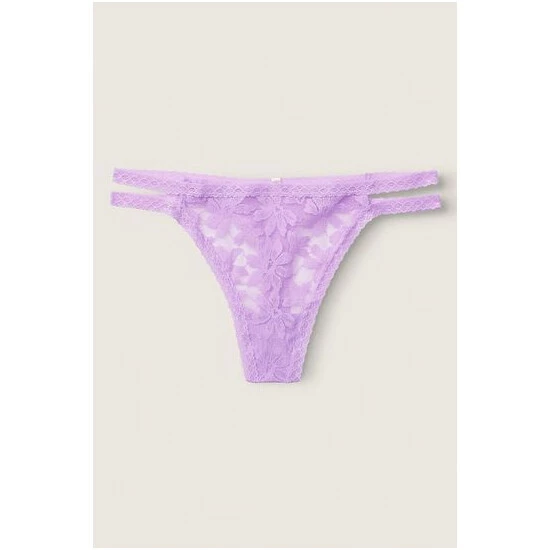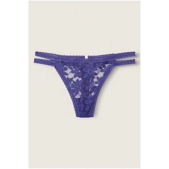 Allover floral lace. Strappy lace trim side detail. Thong coverage. Low rise.