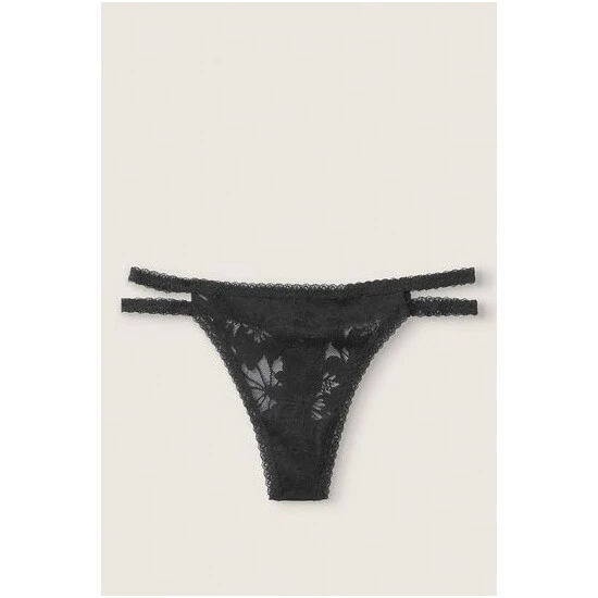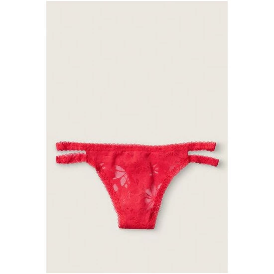 Allover floral lace. Strappy lace trim side detail. Low rise.
