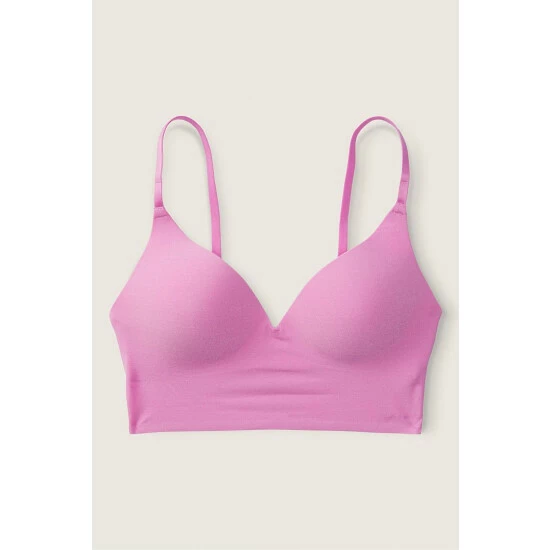 Smooth, No Show Fabric. No underwire. Bonded seams at bottom hem; snug at first, but will stretch with your body as you wear. Push-up. Adjustable plush back straps. Longline pull on style. Rose gold hardware.
