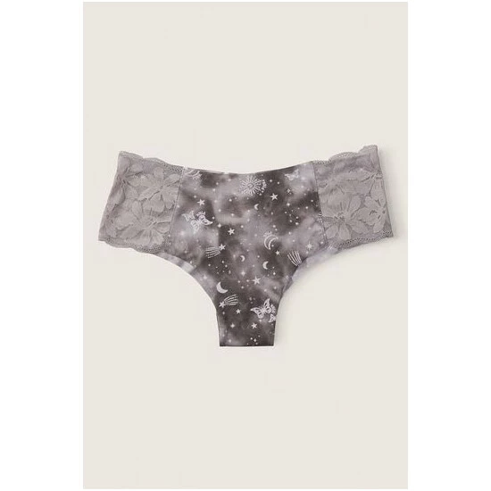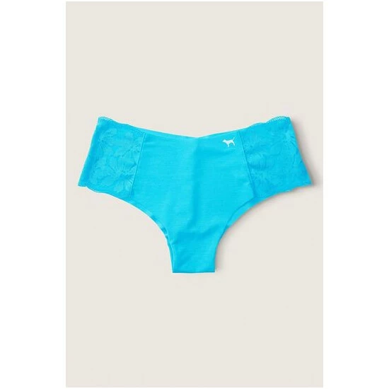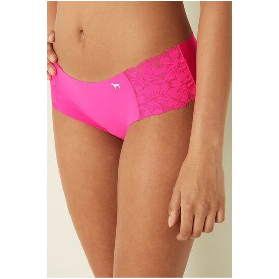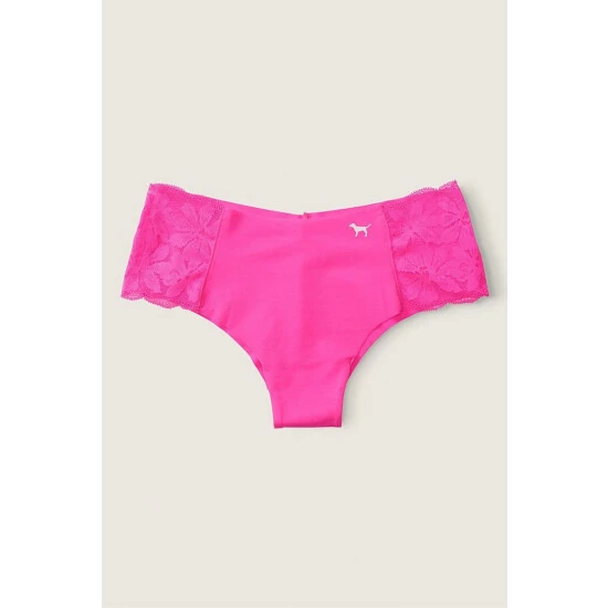 Cheekster coverage. Floral lace trim. Low rise. Seamless raw-cut edges. No show through.