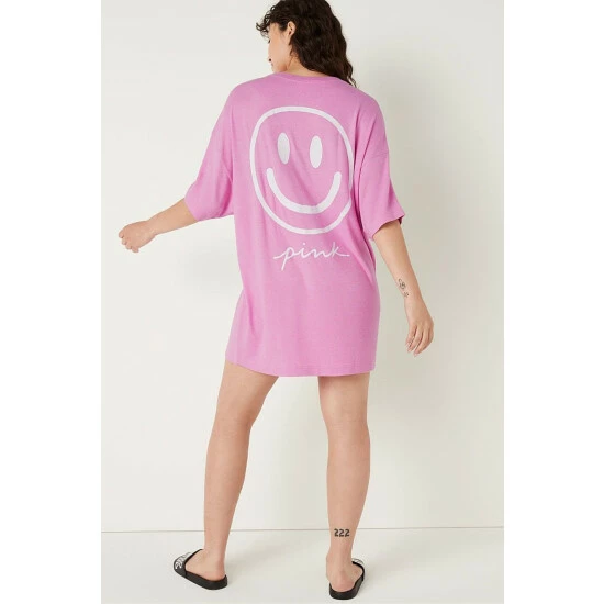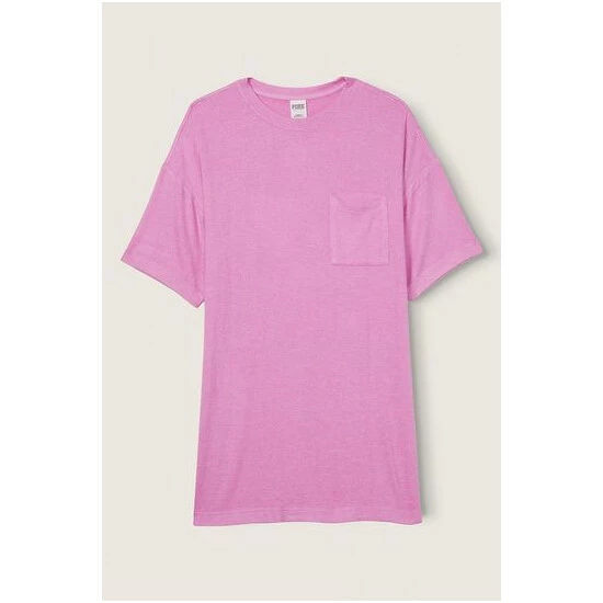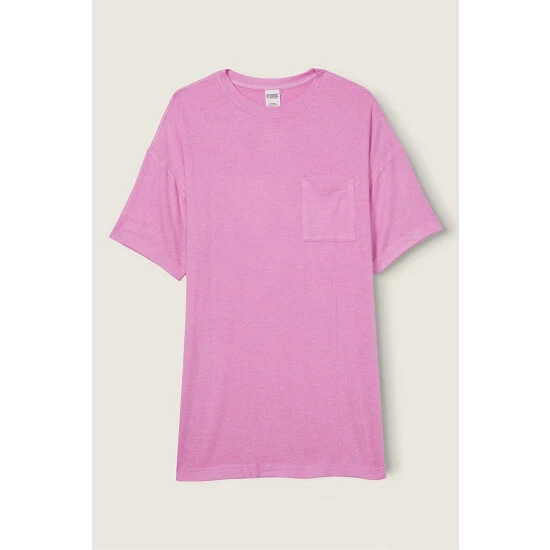 Relaxed fit. Short sleeve dress with chest pocket 32 body length. Cozy jersey fabric.