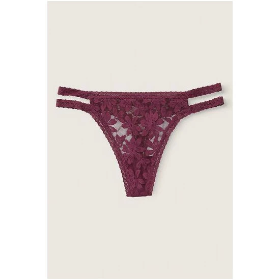 Allover floral lace Strappy lace trim side detail Thong coverage Low rise Imported: nylon/recycled nylon/spandex.