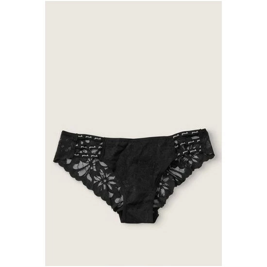Cheekster coverage. Strappy front with mini logo details. Allover floral lace front with galloon lace back. Low rise.