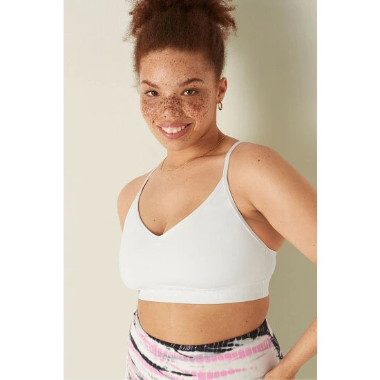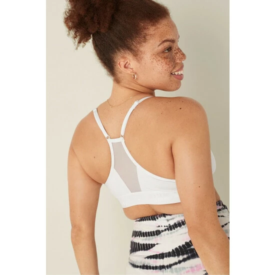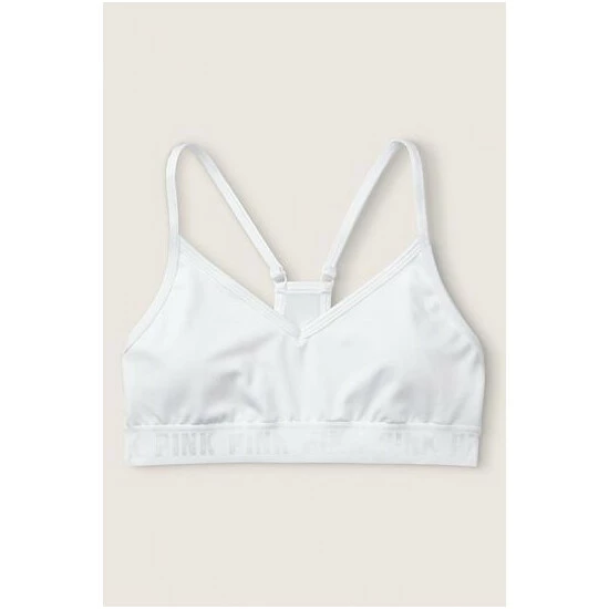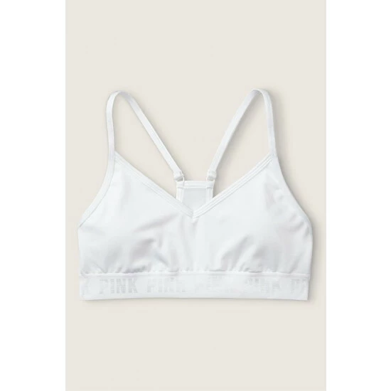 Lightly lined, wireless. Removable padding. Pull-on style. V-neckline with adjustable straps. PINK logo elastic bottom band. Low impact, 4-way stretch, wicking fabric, quick dry fabric.