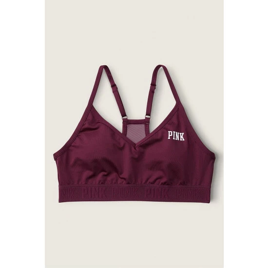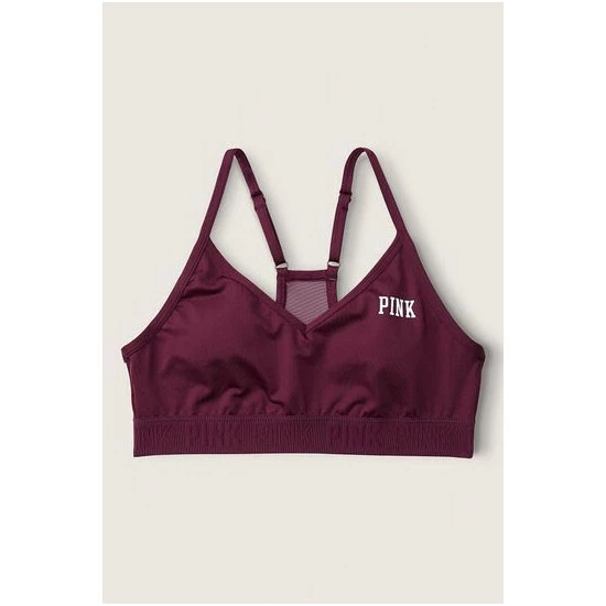 Lightly lined, wireless. Removable padding. Pull-on style. V-neckline with adjustable straps. PINK logo elastic bottom band. Low impact, 4-way stretch, wicking fabric, quick dry fabric.