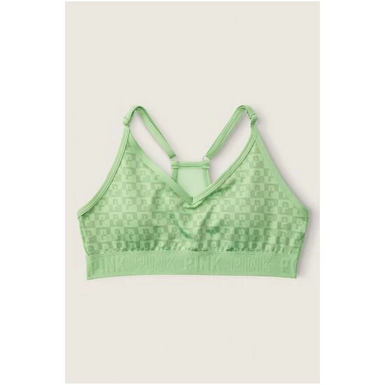 Lightly lined, wireless. Removable padding. Pull-on style. V-neckline with adjustable straps. PINK logo elastic bottom band. Low impact, 4-way stretch, wicking fabric, quick dry fabric.