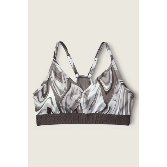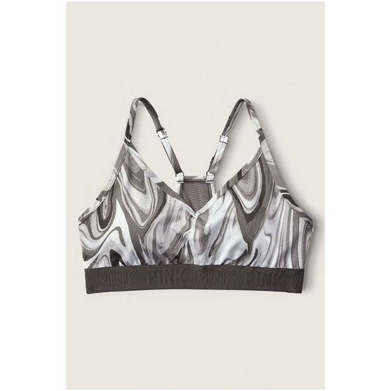Lightly lined, wireless. Removable padding. Pull-on style. V-neckline with adjustable straps. PINK logo elastic bottom band. Low impact, 4-way stretch, wicking fabric, quick dry fabric.