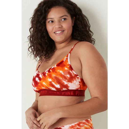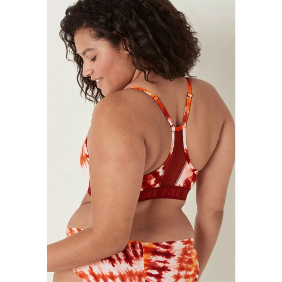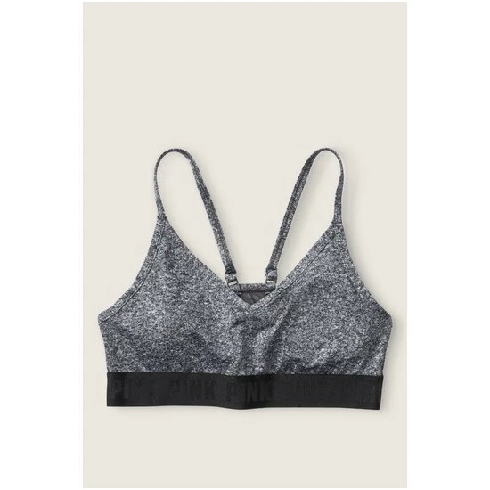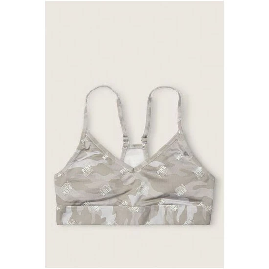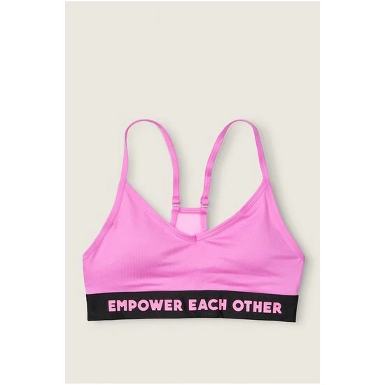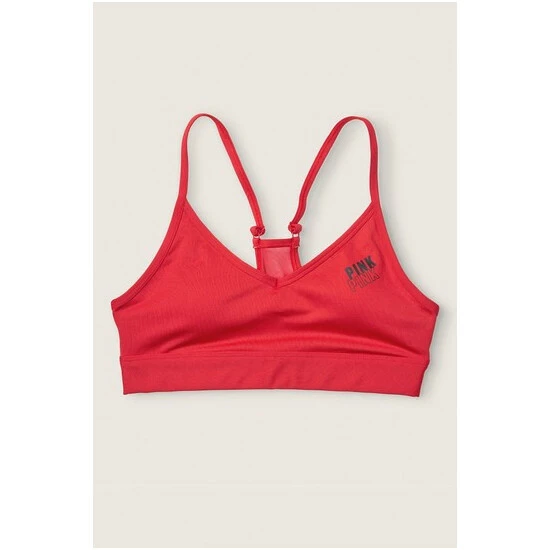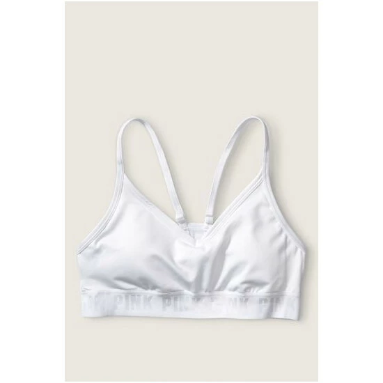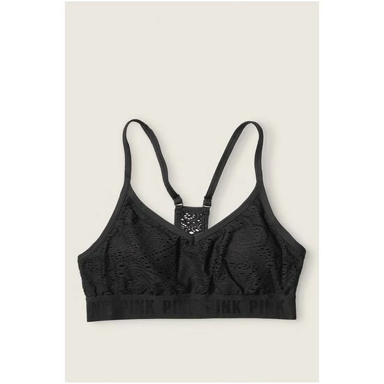 Lace overlay, wireless, padded sports bra. PINK logo elastic at bottom.