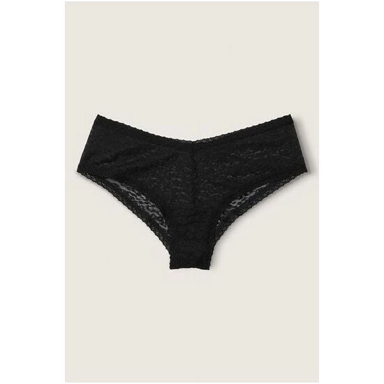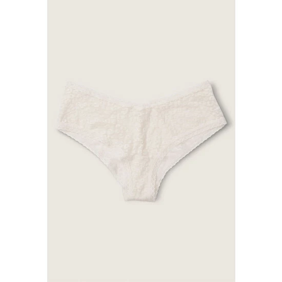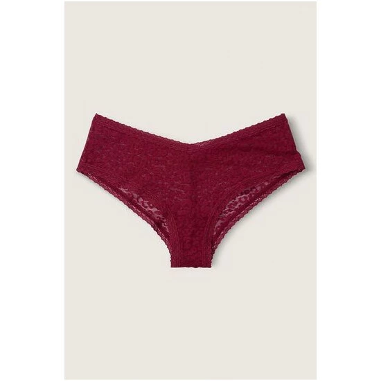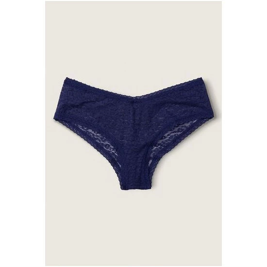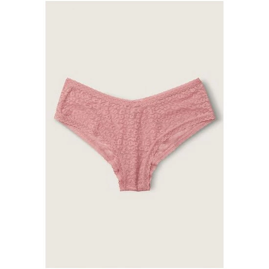 Allover leopard lace. Cheekster Coverage. V-cut front. Low rise.